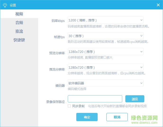 点击"设置"按钮可以调节视频、音频、推流与快捷键的设置
