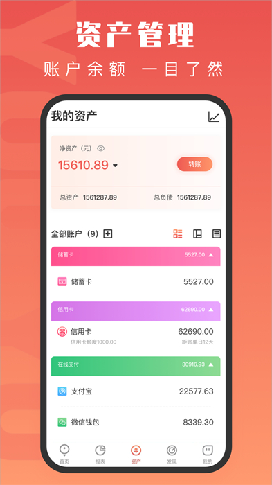 3.多样资产一览无余,现金、银行卡、投资账户,收支清晰明了。