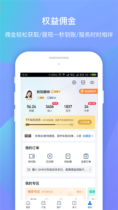 您的保险展业利器,专注为您实现财富梦想。快捷在线投保,立即获得佣金,提取现金实时到帐,可推广您的门店让客户自助投保,客户维护及时跟踪,能力培养让您更快成长,团队管理助您高效获客,获得成长津贴。