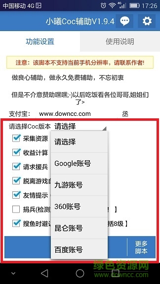 2.请选择coc版本,根据自己的coc版本来选择,比如昆仑的就选择昆仑帐号