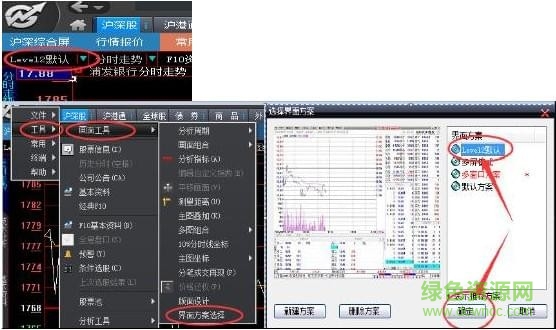方案二:点击分时图左上角切换LEVEL2默认,或是点击工具-画面工具-界面方案选择-选择Level2默认界面;