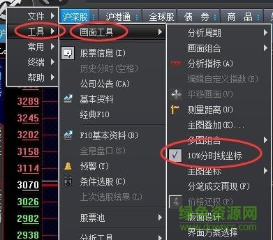 答:方案一:查看分时图左侧坐标轴是否是10%,如果为10%,则点击分时图右上角的黄色10%按钮或是点击工具-画面工具-10%分时线坐标去勾;