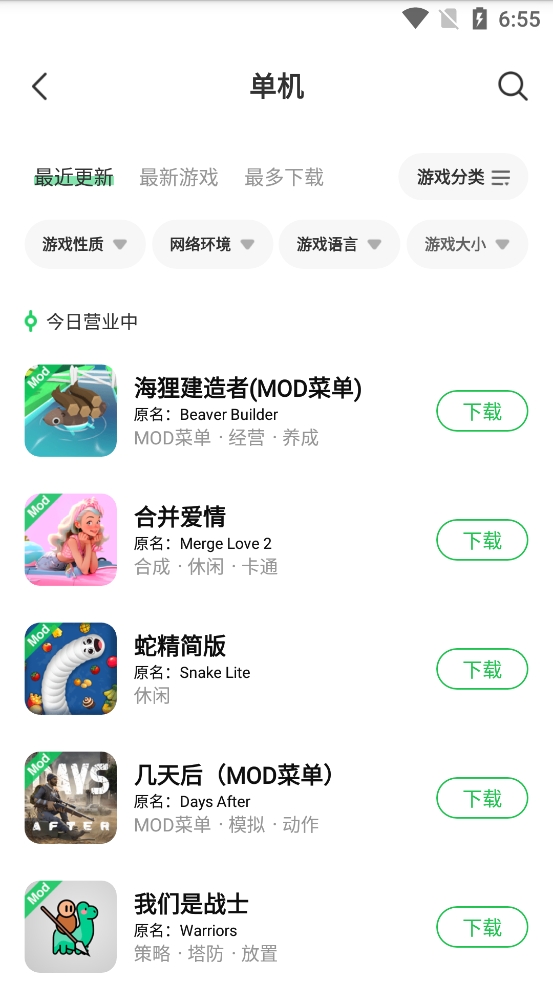 2、在单机页面中将会看到各种有关单机游戏的内容,可以看到最近更新、最新游戏和最多下载等选项;