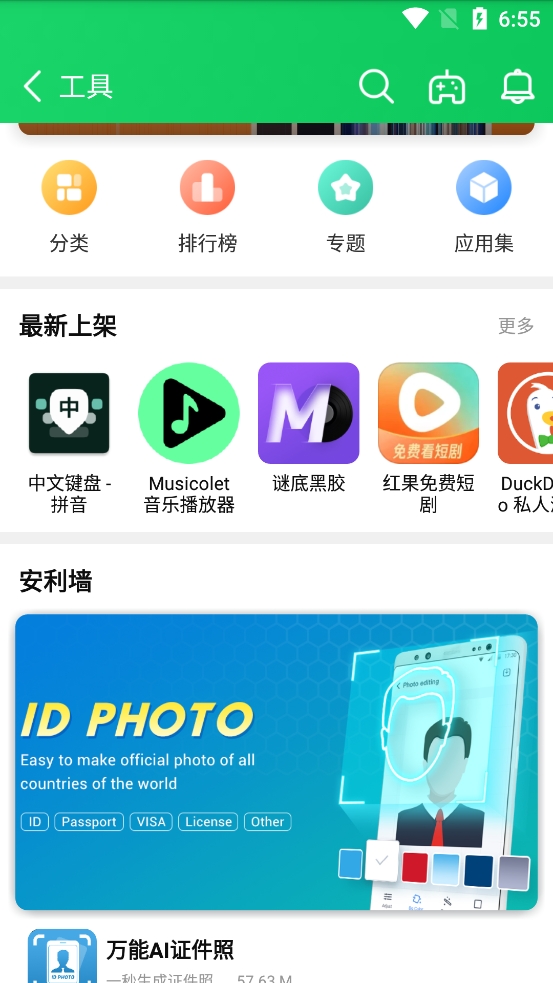 3、工具栏目中将会看到一些应用软件,针对应用进行详细的分类管理、排行榜、专题和应用集等;