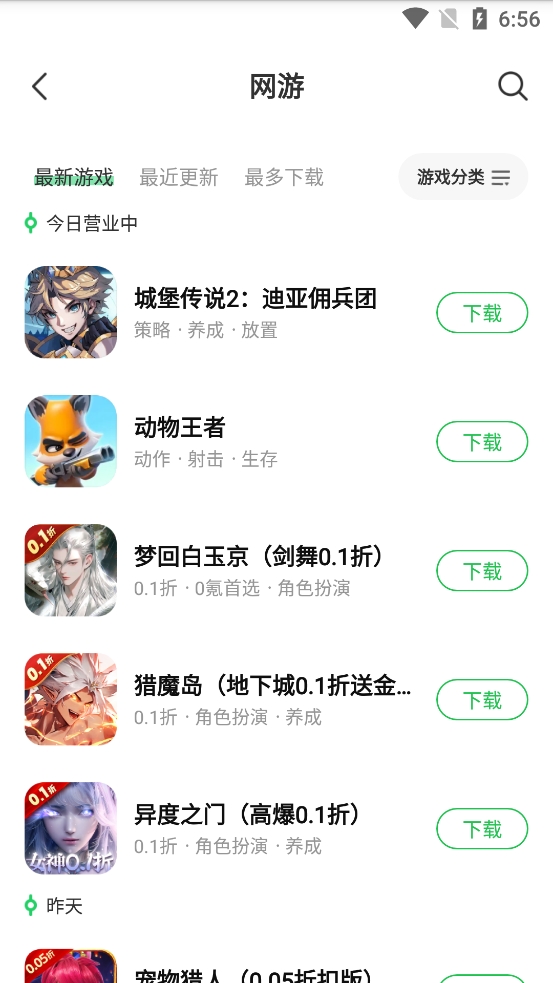 4、在网游栏目中将会看到如今最新上线、最近更改新和最多下载的游戏,快速查看最近有哪些网游;