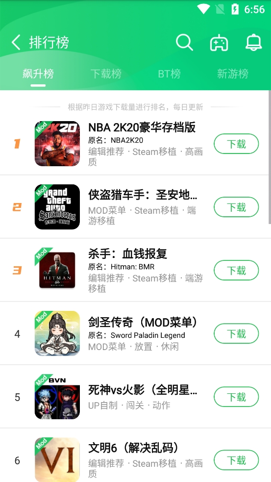 5、排行榜中将会看到如今游戏用户们比较喜爱的游戏,提供实时更新的飙升榜、下载榜、BT榜、新游榜;