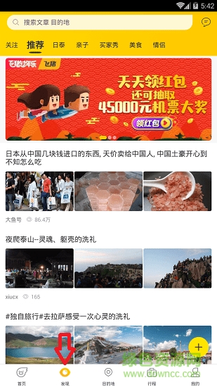 1、首先,我们到飞猪旅行官网或者其它的应用市场下载飞猪app,打开app,在正下方点击“发现”一栏,我们可以听过上方的搜索框进行搜索或者直接点击下面的推荐的地点;