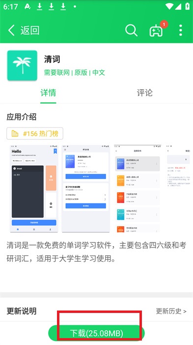 3、点击想要下载的软件进入到详情界面,在详情界面中的下方就可以看到【下载】的绿色按钮,点击进行下载;