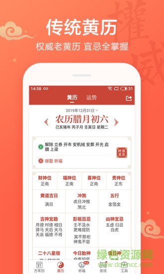 吉祥万年历免费安装app是一款非常好用的万年历黄历app,支持在手机上查看日历,自带权威老黄历,可以看详细的运势和吉凶,支持日历记事和查看天气,欢迎喜爱的朋友到绿色资源网下载使用!
