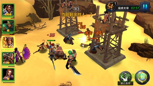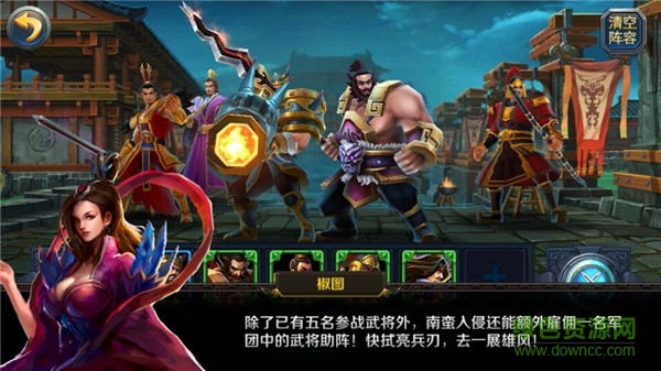 玩家最多可以选择5名武将参与战斗。各种职业等级可以选择比较互利的进行搭配,我方共有5个出战位置:前排、中排左侧、中排右侧、后排左侧、后排右侧。而且在战斗前玩家可以调整每个武将的出战位置,这里的武将搭配和位置的合理放置也是很有利乐趣和开洞大脑的一部分玩法。