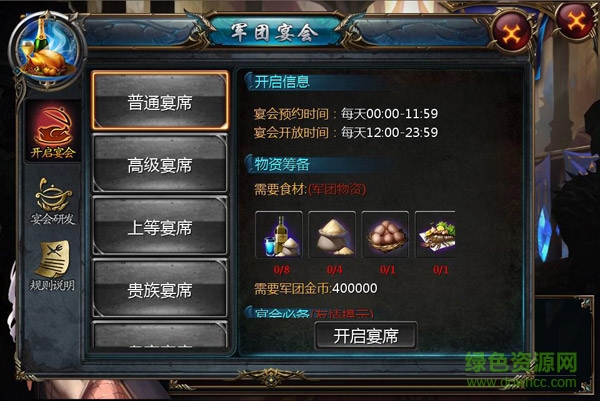 不同的宴会等级所对应的开启条件是不一样的,开启宴会需要消耗宴会等级所对应的军团资金以及食材。