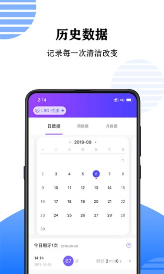 4、刷牙数据:通过每次同步数据可记录您的每次刷牙结果,您可以日、周、月的形式查看自己的历史数据。