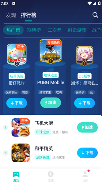 2、在首页切换到排行榜有各种热门榜/期待榜/二次元/射击游戏等等不同的榜单类目,用户可以根据需求快速筛选;
