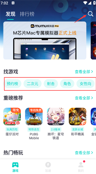 1、首先下载安装好软件,在软件首页有丰富的游戏资源,以及找游戏的分类,支持直接点击右上角的放大镜标志进行快速搜索;