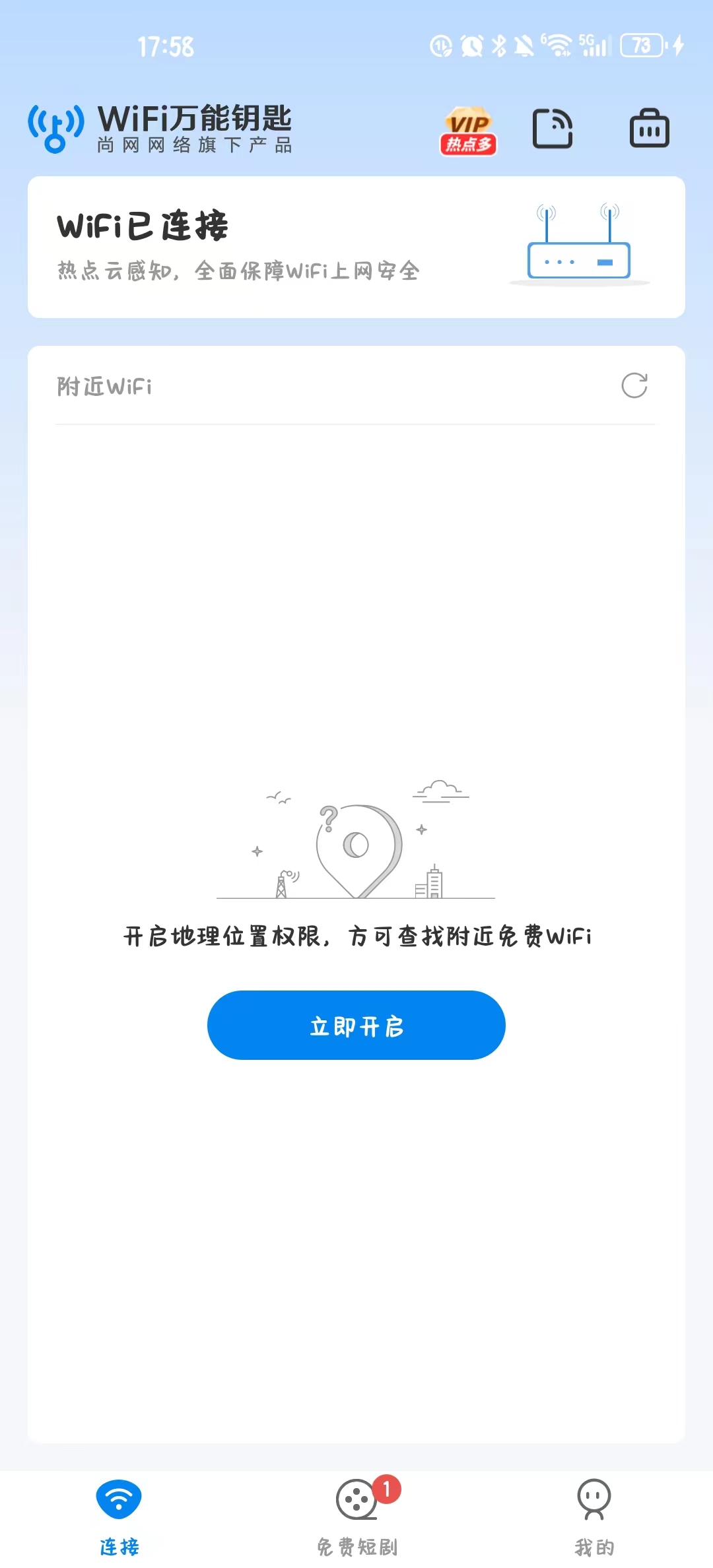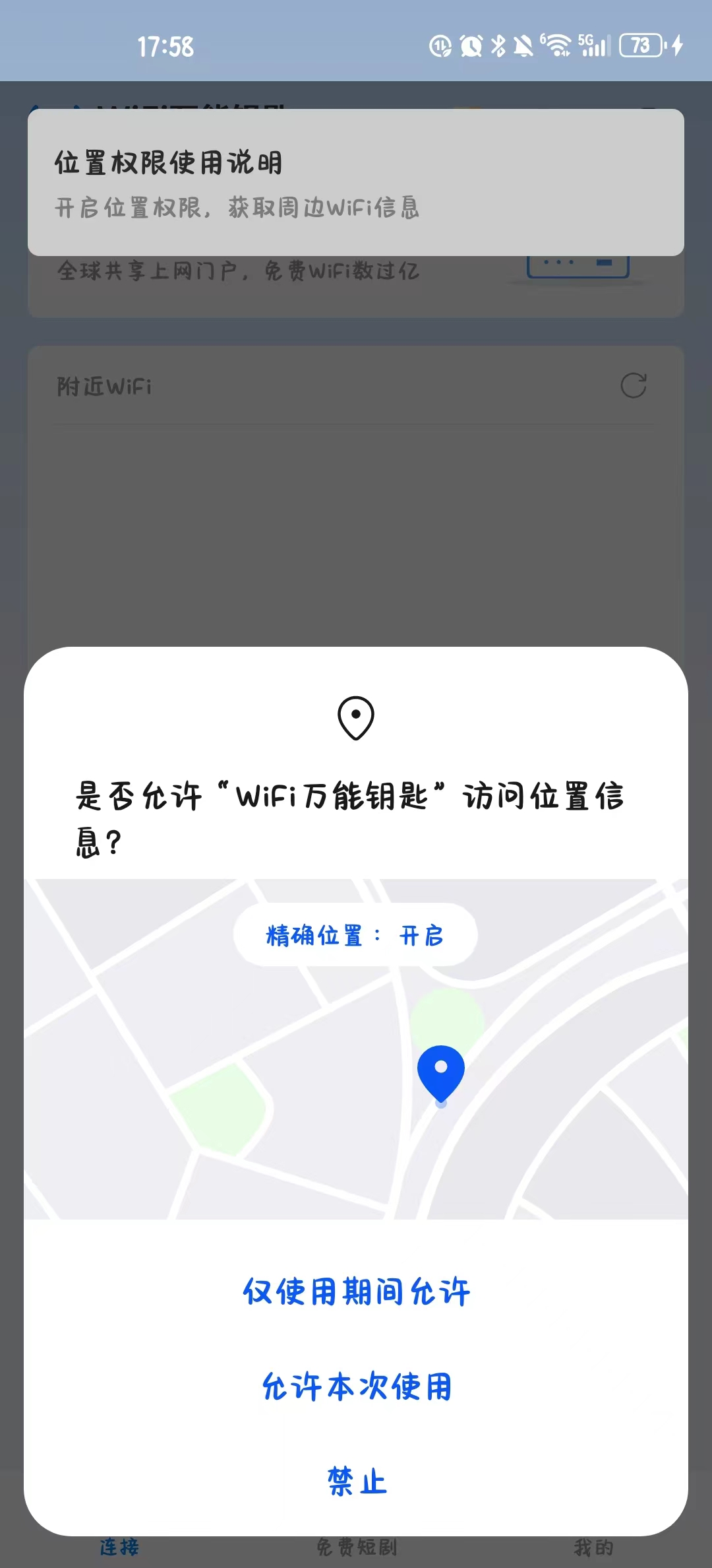 1、进入页面后需要开启地理位置权限,才能够精准定位并查找附近免费WiFi;