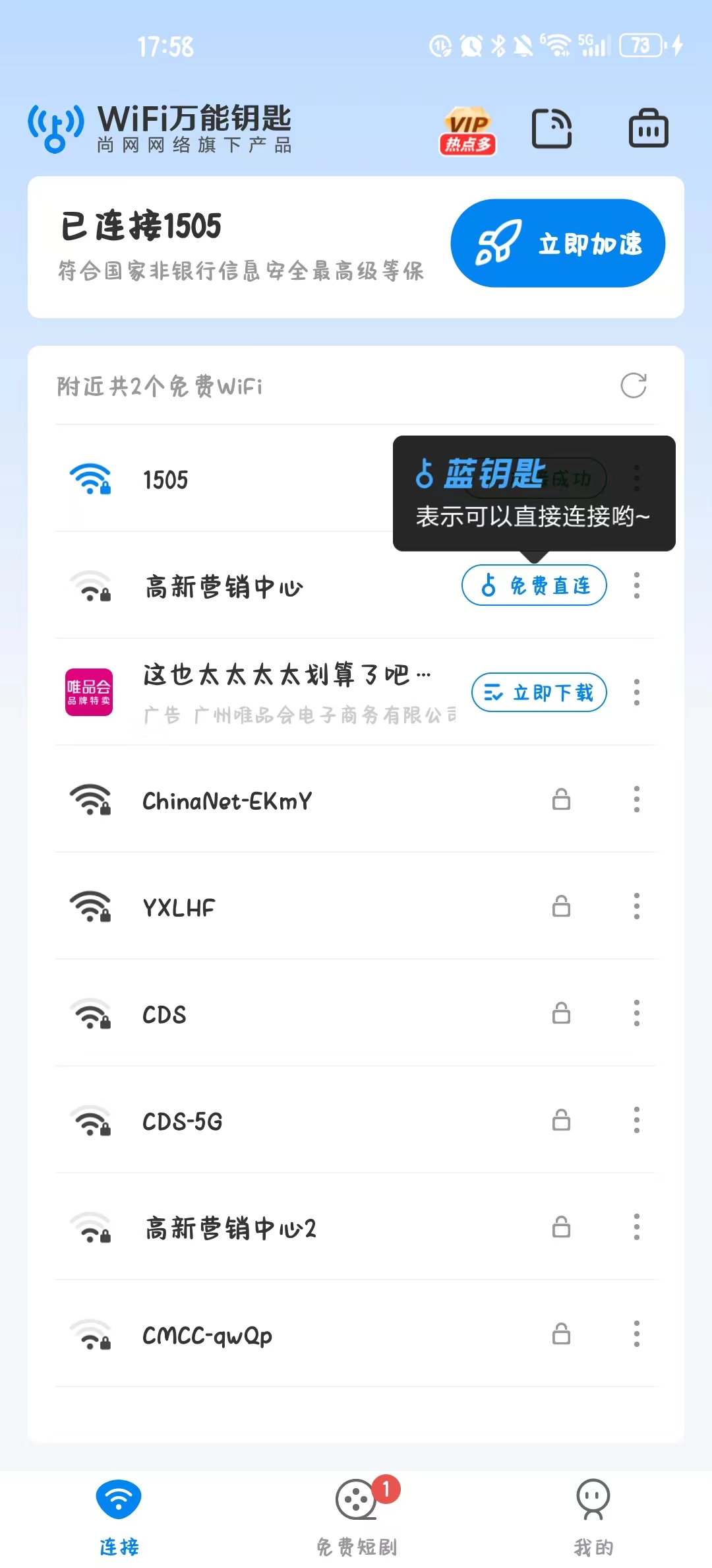 a:若该加密wi-fi热点已共享,则可以使用万能钥匙进行连接使用;若该加密wi-fi热点尚未共享,则您可以共享该热点。