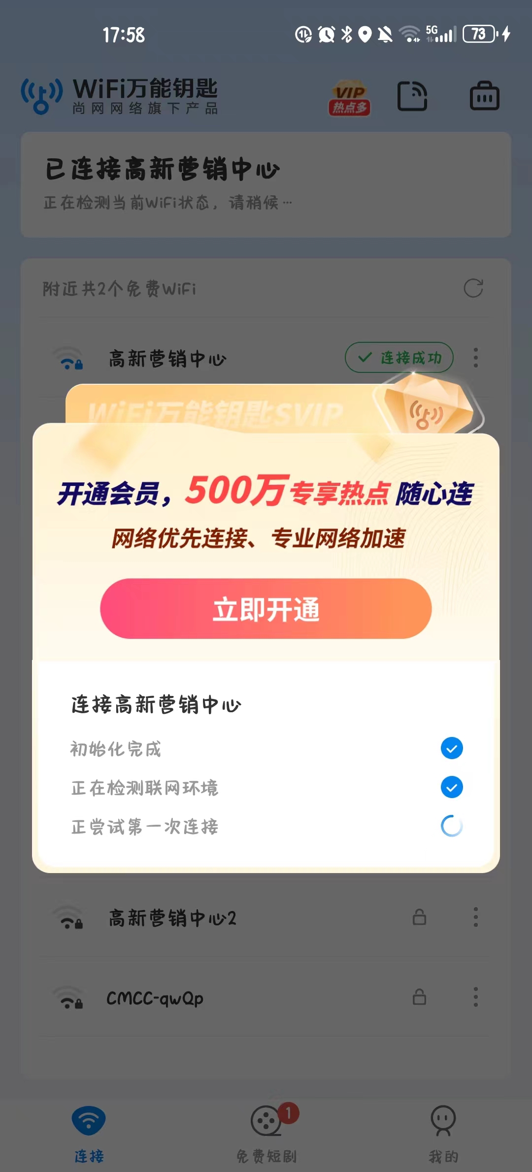 4、点击有蓝钥匙的WiFi后将会自动进行连接,并进行初始化和检测网络环境后即可连接。