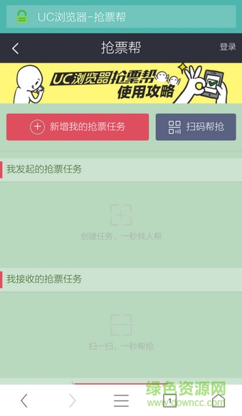第一步:打开uc浏览器,从手机酷站里点“抢车票”,进入uc抢票专家,需要事先准备好铁道部12306网站的账户密码,然后登录。