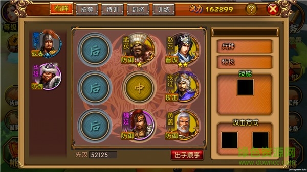 排兵布阵即对战斗阵容的调整,根据战斗的具体情况调整出最合适这场战斗的阵容可最大限度减少自己所受攻击以及最大程度打击敌人,可见这是非常重要的战略要素,比如利用地形提高作战效率等。进入武将界面,玩家可以通过拖动武将进行布局。