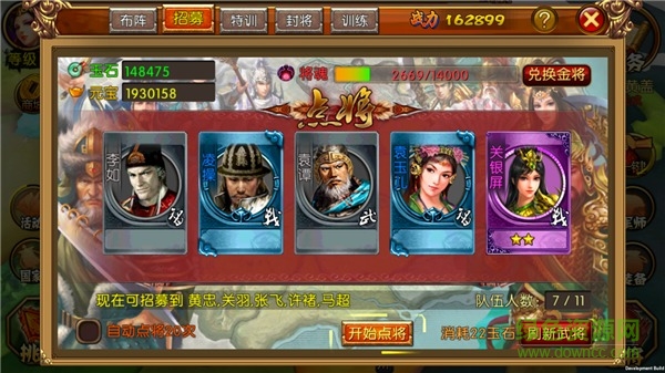 武将招募有两种,一种是通过玉石直接翻牌招募,不过是有系统随机选择武将,所以有可能翻出来的武将不是自己需要的。没有关系,可以让其充军从而获得将魂,也就是第二种招募武将的方式,利用将魂兑换更高级别的武将。