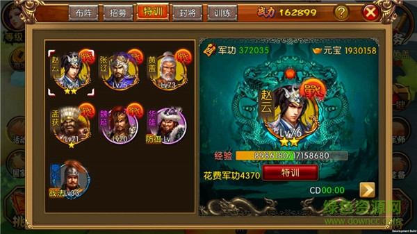 通过特训可以来提升武将的等级。特训需要消耗军功,同时达到一定特训次数后,武将特训需要CD冷却时间,玩家可以用元宝直接免去CD耗时。