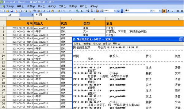 STEP3:导出微信聊天记录是用户最关心的一类应用,同步助手当然也具备此功能。而且我们可以分类型导出。文本消息内容通过界面左上方的导出按钮就可以办到。软件提供了TXT和excel两种存储方式,如图3所示。相比较而言,Excel方式更方便后期的查询。