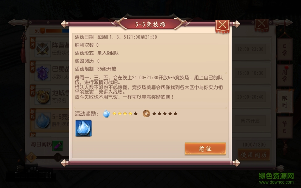 玩家到达35级后可进入5-5竞技场。5-5竞技场每周一、三、五晚21:00-21:30开放,玩家单人或组队进入均可,体验团队合作PVP的乐趣。若单人或组队人数不够时,竞技场美眉会为玩家匹配各区中实力相当的其他玩家一起组队进入战场。不论战斗成败,玩家均能获得大量经验奖励。