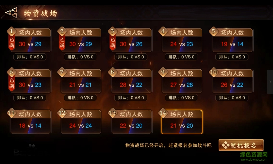 玩家达到22级后就可以在每日20:00-20:40期间参加“物资战场”。物资战场是阵营掳掠抢夺战,能获取大量声望和经验。阵营双方可以在物资点掳掠物资,也可以袭杀敌方阵营成员换取物资。积累的物资点越高,结束时可换取的奖励越丰厚。40VS40的阵营大战极其需要阵营团队配合,也十分考验阵营指挥功力。在双方人数旗鼓相当时,做到以最小的代价换来最大的掳掠成果。
