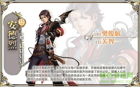 来自于暗影世界,年少时与父母一起被杀害,并被吸血鬼始祖德古拉赠予科学家弗兰肯斯坦,改造后复活的安德烈意外地恢复了部分记忆。猎魔人公会突袭研究室时救出了安德烈,并培养他成长为一名优秀的猎魔人。但他并没有遵守公会的规则,而是自行去追猎所有的暗影生物。