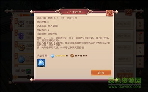 玩家到达35级后可进入5-5竞技场。5-5竞技场每周一、三、五晚21:00-21:30开放,玩家单人或组队进入均可,体验团队合作PVP的乐趣。若单人或组队人数不够时,竞技场美眉会为玩家匹配各区中实力相当的其他玩家一起组队进入战场。不论战斗成败,玩家均能获得大量经验奖励。