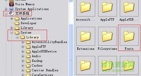 2. 在iFunbox中依次打开路径:/System/Library/Fonts/ Cache