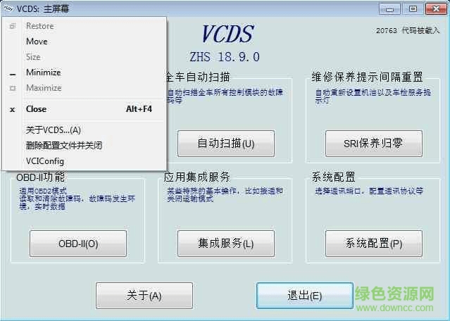 ·在 VCDS 主屏幕的系统菜单(点击 VCDS 主屏幕左上角)加入 VCIConfig 快捷方式