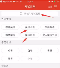 1.打开app,跳过介绍,在外语类别中,找到英语四级或者是英语六级,或者直接输入英语四级或者英语六级,如图所示: