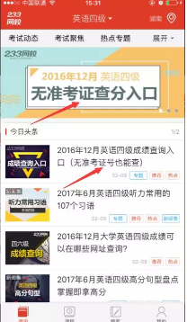 2.点击无准考证入口头图或者点击下面今日头条中的“2016年12月英语四级成绩查询入口”如图所示: