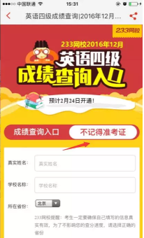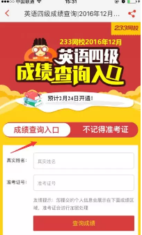 233网校四六级成绩查询app用来查询2016年12月四六级考试成绩!支持准考证、面准考证输入查询!参加过12月份英语四六级考试的学生此刻一定想要知道自己的分数吧!那就安装小编提供的操作不步骤一步步来吧!