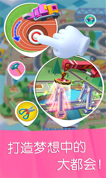 城市建设任务多,操作挖掘机、起重机、割草机等13款工程车,铺管道、搭钢筋、砌围墙、刷油漆......创建6大主题建筑,体育馆、商业区、居民区、公园、铁路、桥梁。(认识工程车,锻炼儿童手眼协调能力)