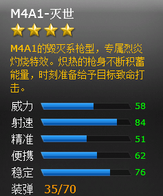 2.【M4A1】 这把枪是火线精英中比较稳的枪,而且威力不小,适合新手玩。它相对AK轻一些,所以特别适合打冲锋,后座力也比AK小很多,另外,推荐M4+沙鹰,是爆破的最好配对。