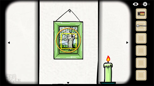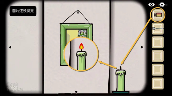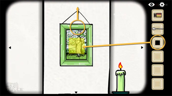把方块放在相框下面的凹槽处,然后放相框下来。点击相片里的小正方形,进入下一关…