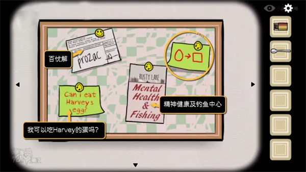 为了缓解病情,劳拉决定出发去一个叫“锈湖”的精神健康及钓鱼中心进行疗养。她养了一只叫Harvey的鹦鹉。某天突发奇想,想吃掉Harvey的蛋,但在她煮熟了蛋之后,却在蛋里发现一个黑方块。
