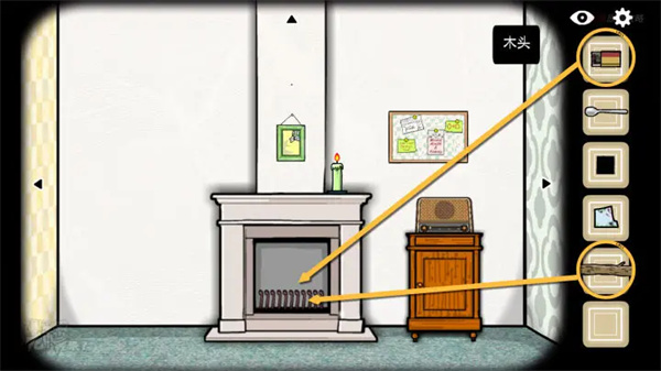 春天-壁炉视角:将【木头】放到【炉芯】中,并用【火柴】点燃(每一个季节关卡都需要将壁炉点燃,这是穿越方块,穿越指其他季节的要素)
