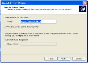5. 输入打印机名称 (例如:Argox OS-2130D PPLA),接着选取「不要共享这个打印机」,然后按「下一步」