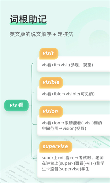 联想记单词app主要通过联想记忆的方法来记忆单词,单词是学习英语的基础,很多时候面对一个比较复杂陌生的单词往往需要花费很长的时间才能记忆,联想背单词软件以一种生动形象的拆分联想方法让用户在理解的基础上进行记忆,让记单词变得有趣并且容易记忆!