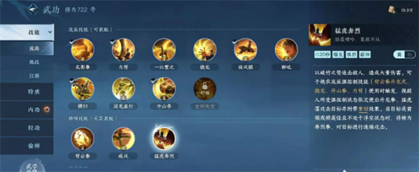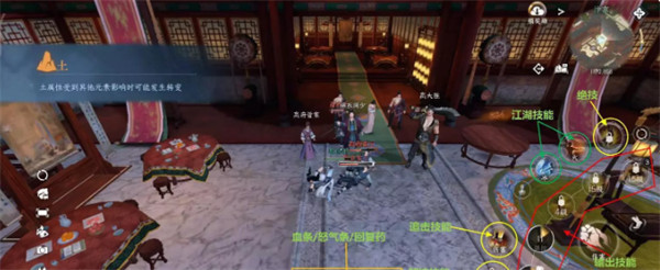玩家除了可以携带5个职业技能外,还可以在右上方携带一个绝技和江湖技能。这里大家先简单做个了解,后面我会单独出一期攻略详细展开说。右下方有两个技能是默认带的,一个是追击技能,一个解控技能,达到特定条件时才会亮起。如被控后会亮起解控按钮等。
