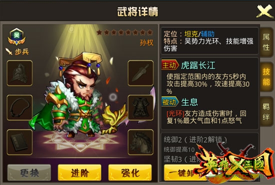A:在武将详情界面可切换到【技能】选项卡,即可方便的操作技能加点,了解技能详情。