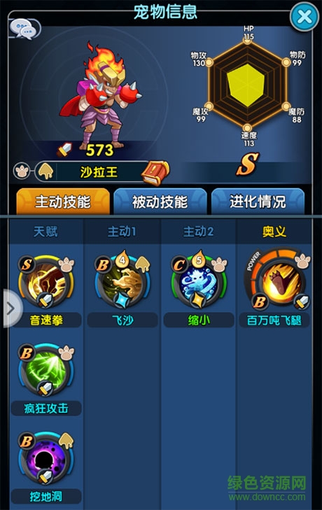 先分析一下这只宠物的潜力,通过六维属性了解沙拉王的物攻以及速度仅仅是一般,主动技能方面天赋中的音速拳是高威力高百分比技能,疯狂攻击速度追击,挖地洞则较为一般。但是其被动栏中没有援助槽,5个全部为被动槽,这点就很有操作性了。