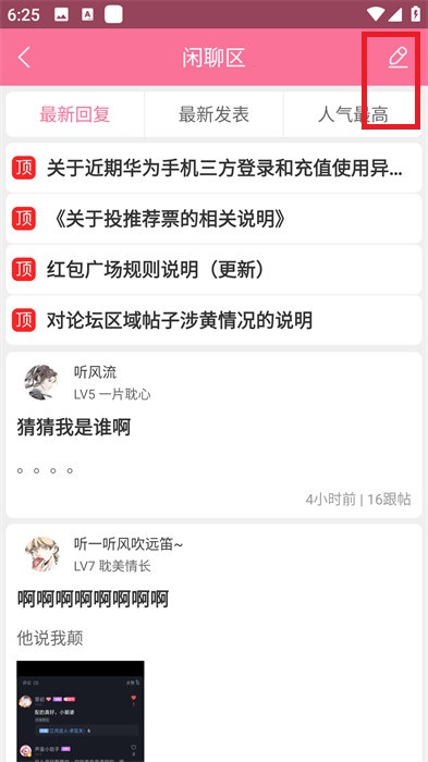 3、该功能界面中,用户能够点击右上角的【铅笔】标志进入到发布帖子页面;