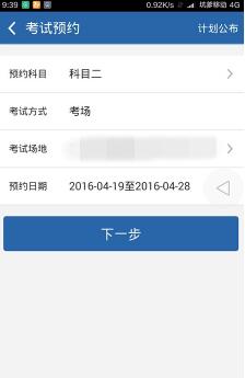 3.核对自己信息,确认无误后,点击下一步。在这里要提醒下,因为有些人已经是有摩托车证或者其他驾驶证,所以我们可以看到考试原因写着:增驾申请。一般无证新手申请都是写着:初次申请。