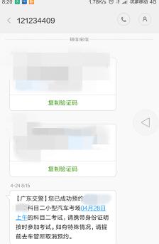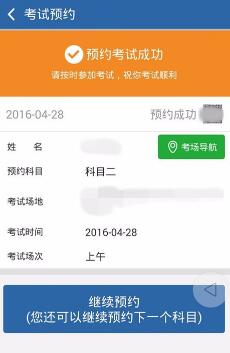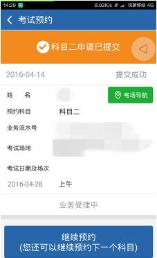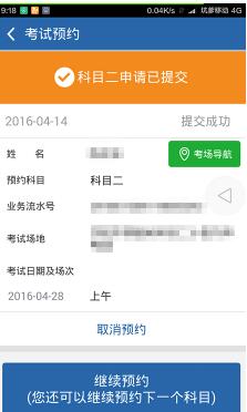 5.当我们操作完毕后,可以通过点击首页的考试预约进入,会出现提交成功提示,如下图,等过二十分钟后,“业务办理中”变成“取消预约”;