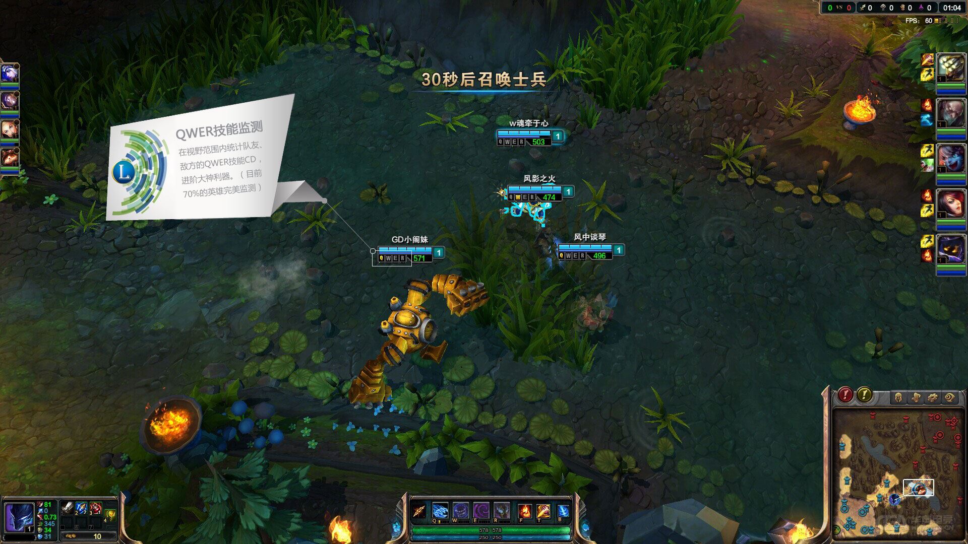 QWER技能监测:在视野范围内统计队友、敌方的QWER技能CD,进阶大神利器。(目前70%的英雄完美监测)
