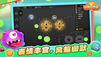《萌菌大作战》是一款由同城游2017年推出精品之作,采用大细菌吞噬小细菌简单玩法的移动游戏,游戏将一个简单的大细菌吃小细菌的过程变成了一个乐趣无穷的休闲游戏竞技手游。用户在实时对战游戏中可对抗,可合作,快来享受这对战的乐趣吧!更是一款画面呆萌,玩法又有挑战性,您可与其他用户实时对战的休闲游戏。在这个萌菌的世界里,每个人都化身为一个独特的萌菌,大细菌吞噬小细菌,努力生存下来就是用户的唯一目标。用户可以通过吞噬草球或者其他比自己体积小的细菌可以快速成长。通过吞噬养份可以缓速成长,细菌长大后移动速度会越来越慢,如果想增加移动速度可以通过分裂和喷射等有效手段。另外用户可以通过更换自己的皮肤来更换细菌的外观,增加游戏的乐趣性,呆萌的表情让你爱不释手!